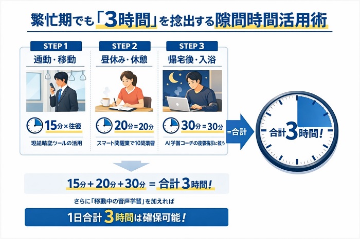 このように、スタディングのスマート問題集や理論暗記ツールは、机に向かえない時間を「合格への投資時間」に変換する装置となります。